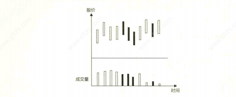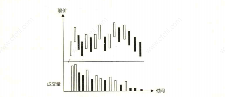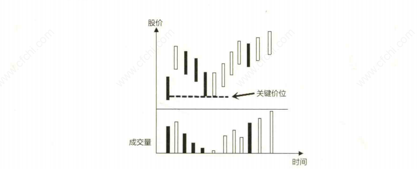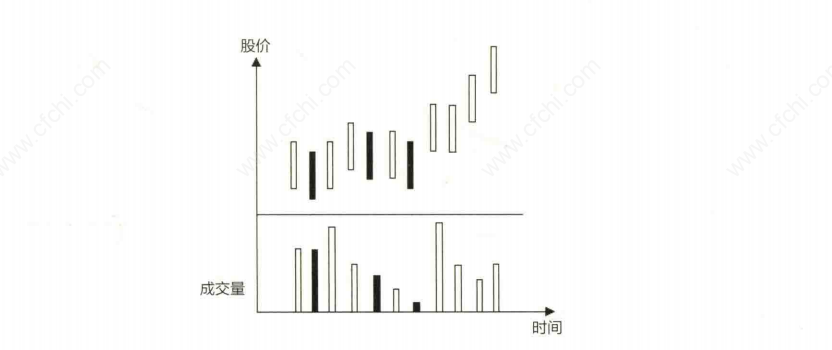 3.股价在下跌的过程中成交量无法持续放大,在重要的支撑位会缩量企稳,上升途中成交量缓慢放大(如图下所示)