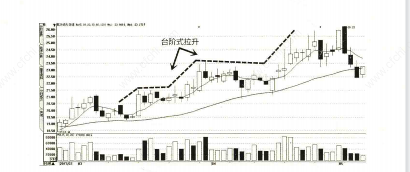 由于一些庄家自身的实力比较有限,并且操控的还是中大盘股,在吸筹阶段所得的吸筹占筹码总量比例不大,所以只能将股价拉升到一个高度后盘整,提高散户的持仓成本,再次拉升股价,如此重复操作。在台阶式拉升的过程中往往不会出现大幅度的洗盘过程,这是因为,一方面庄家的持仓量比较低,没有过多的筹码可以用于砸盘。另外,庄家也比较担心过于凶勐的洗盘会引起恐慌性抛售,自身没有足够的资金可以吃掉所有被抛出的筹码。于是庄家就采取拉升一个台阶再横盘的整理方式来给部分散户“安全感”。