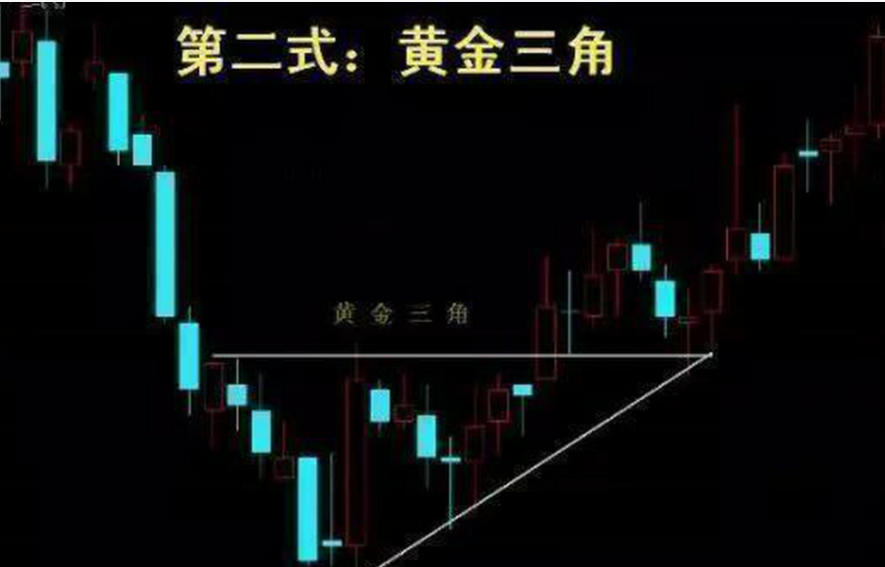 股价两头往中间靠拢,形成一个夹角,这个就是我所说的“黄金三角”。当股价是在黄金三角之内或者是在三角边缘线处,此时若是成交量放量,资金流进,那么股价将突破黄金三角边缘线的上边,开始加速上升。黄金三角形态越扁,说明后市上涨的爆发性越强。