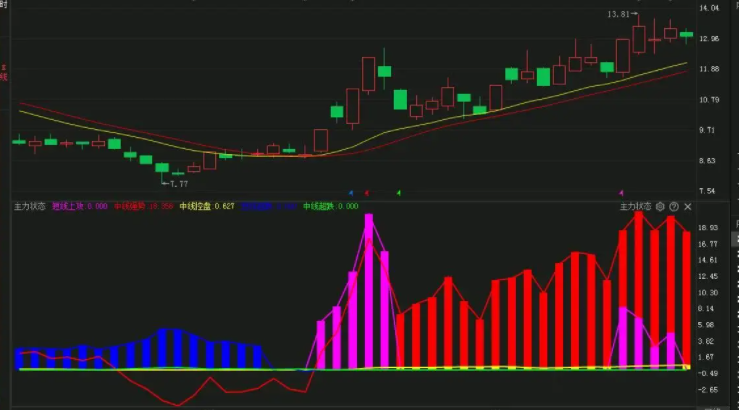 形态特征:主力完成建仓、洗盘等常规工作在底部拿到足够筹码控制局面,此时个股走势会符合这样几个盘面特征:1.盘面中筹码十分集中,股东人数直线下降;2.成交开始稀少,有的甚至于走势断断续续,极不流畅;3.走势和大盘脱节,多呈独立行情;4.没有其他实力相当的机构埋伏其中,唯一的主力在其中对价格走势拥有绝对的发言权。注:人均持股数超过5000股的品种肯定是绝对控盘,而3000——5000股基本上属于相对控盘,人均少于2000股的基本属于无庄行情。