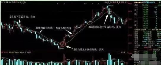 操作其实很简单,大家先把多余的均线去掉,设定好2日线和10日线跟庄均线设置。如果2日均线上穿10日均线,我们可以大胆买入,相反,2日均线下穿10日均线,则可以果断卖出。如下图:
