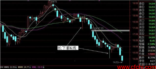从上图中可以看出,虽然K线收出了长下影线,但股价并没有获得支撑,而是继续下跌。