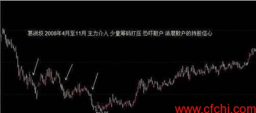 先少量买入打压股价,后大量建仓,在下跌过程中成交量萎缩股价屡次创新低,目的是用少量筹码打压,恐吓散户,消磨散户的持股信心。