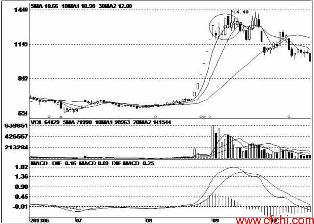 因此,这是庄家拉高出货的手段。投资者遇到短期暴涨的个股时,不要轻易介入,以免落入庄家设置的陷阱之中。在认识判断上,也可以从量度上进行把握,一般连续五个以上涨停板或短期持续涨幅超过60%时,应视为高风险区。无论该股后市潜力大小,这时股价离阶段性头部已经不远了,对于三个以下涨停板或涨幅在30%以下的个股,可以用常规方法进行分析研判。