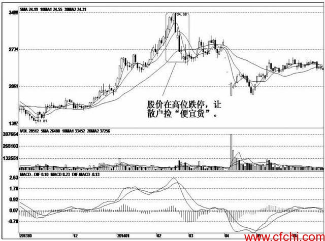 投资者在遇到股价跌停时,要分析股价跌停的性质、所处的位置和庄家意图。辨别这种盘面的方法就是:如果不是庄家出货,属于洗盘性质的跌停,那么股价就会立刻复原,散户根本就不可能买进来;如果散户居然在跌停板附近从容买进许多,且股价弹升又乏力,足以证明庄家以跌停方式出货。