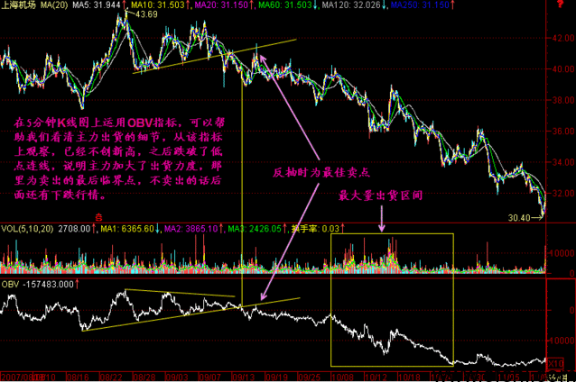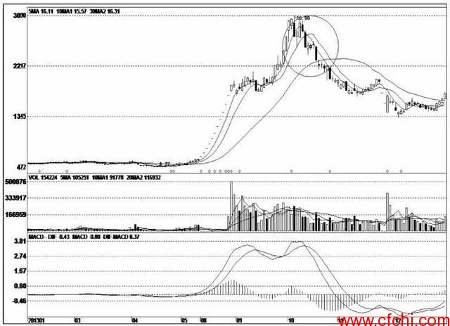 4、股价在庄家快速拉台之后缓慢下跌,或在均线附近长时间停留,成交量逐步放大,这就是庄家利用均线系统派发。