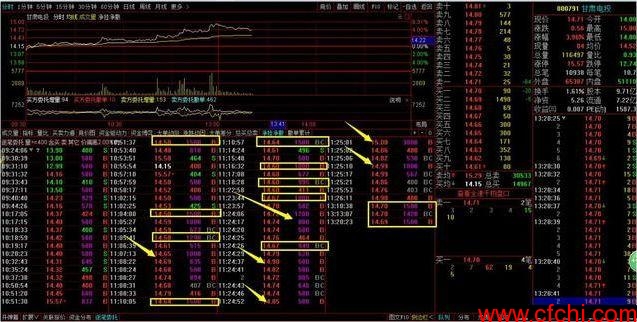4、挑选个股时,观察盘口出现买盘做多单,呈现规律的100手,300手,500手,1500手。