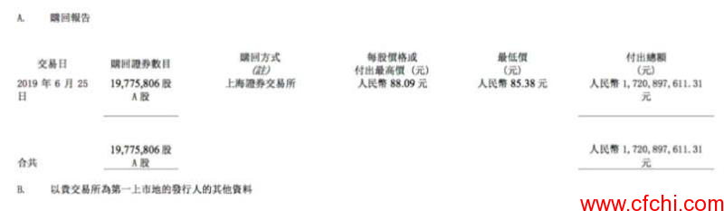 6月19日,继续回购A股股份,数量为1300万股,回购股价最低83.5元,最高84.4元,回购共计支付金额约10.91亿元。