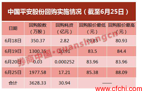 6月25日,中国平安购回A股1977.58万股,支付回购资金17.2亿元,回购最低股价85.38元,最高88.09元。此次回购力度超越此前三次之和。