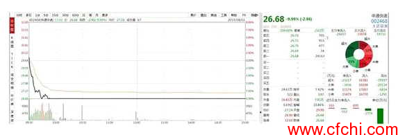小幅高开后迅速下坠,不到上午十点,申通快递股价已经躺在跌停板上了,直至收盘也没爬起来。