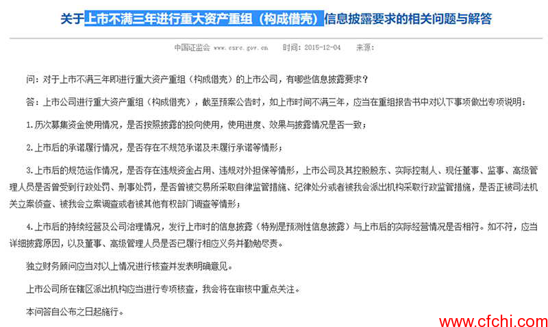 2015年12月,证监会曾专门就“上市不满三年进行重大资产重组(构成借壳)”以问答形式,从募资使用、承诺履行、规定运作等维度进行了针对性要求。(详见下图)