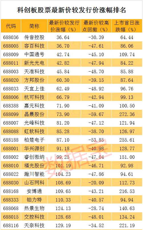 不过,一些大幅回撤的科创板股票较发行价仍有非常大的涨幅。比如微芯生物最新价仍高于发行价171%,柏楚电子现价高于发行价超过87%,晶晨股份超过73%。