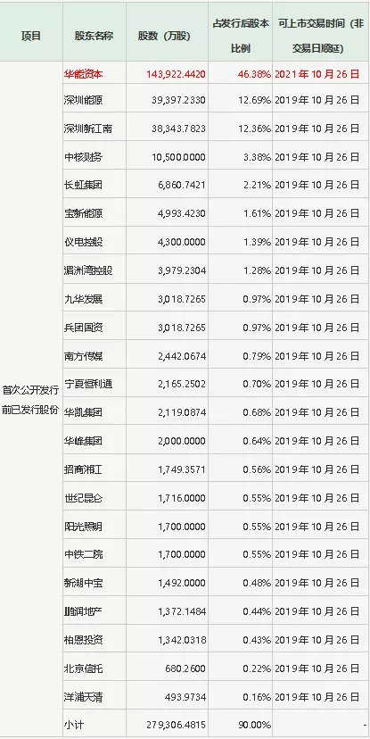其上市公告显示,首次公开发行股份前已发行的股份中,除控股股东华能资本外,其余股份将于2019年10月26日解禁(由于10月26日是周六,正式上市流通日应为10月28日)。以目前最新价计算,解禁市值高达173.02亿元。
