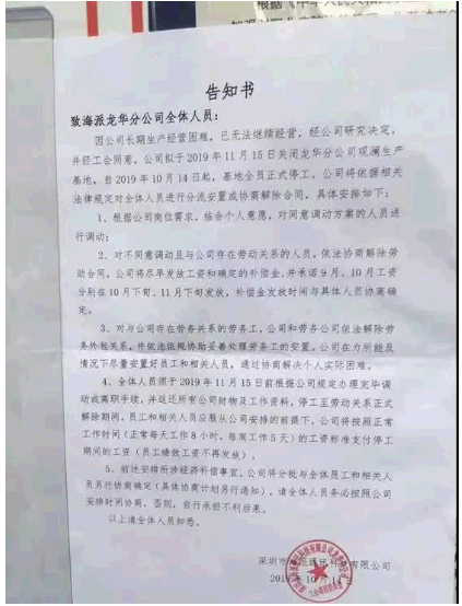 10月14日,智慧海派龙华分公司贴出《告知书》称,因公司长期生产经营困难,已无法继续经营,经公司研究决定,并经工会同意,公司拟于2019年11月15日关闭龙华分公司观澜生产基地,自2019年10月14日起,基地全员正式停工。