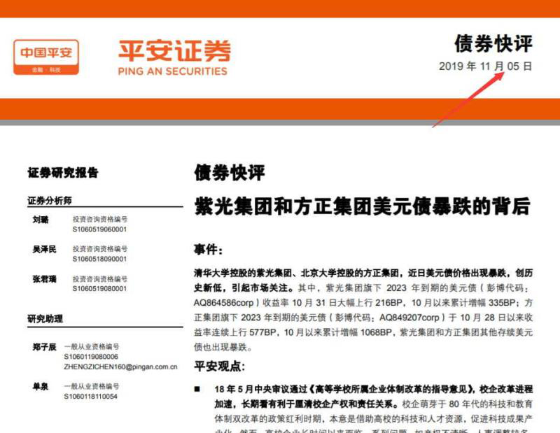 一份券商债券研报或许是紫光国微股价暴跌的导火索。昨日晚间10点左右,平安证券发布债券快评《紫光集团和方正集团美元债暴跌的背后》。在快评中,平安证券表示: