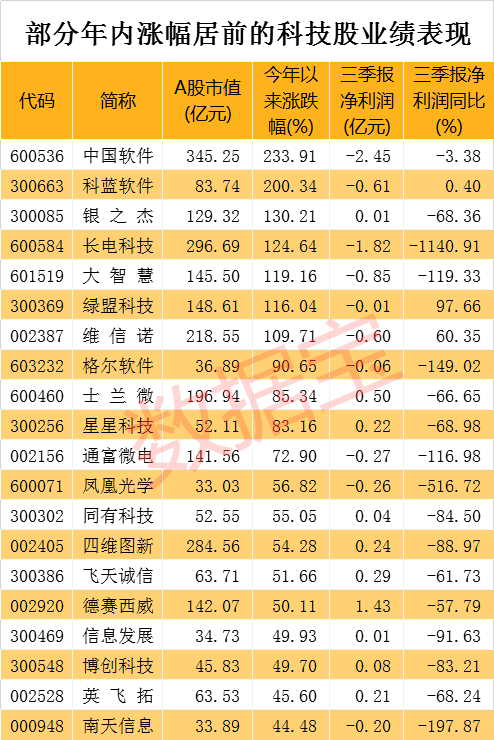 整体来看,这些股票最新价较年内高点平均回落36.05%。7只股票由于此前的题材热炒积累了翻倍的涨幅,分别是中国软件、科蓝软件、银之杰、长电科技、大智慧、绿盟科技、维信诺。与股价对比来看,这7只个股业绩方面乏善可陈,中国软件、长电科技、大智慧、科蓝软件、维信诺前三季度净利润均为亏损状态。