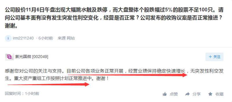 对于昨日的大跌,公司表示“无突发性利空发生”。紫光国微盘后在互动平台回复投资者大跌提问时表示,“目前公司各项业务正常开展,经营业绩保持稳定快速增长,无突发性利空发生。重大资产重组工作按照计划正常推进中。”
