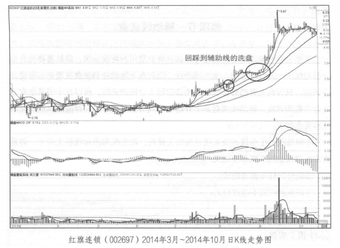 如图所示,红旗连锁(002697)的上升趋势确认后,股价沿着操盘线持续上移,虽然上升过程一波三折,股价不断回踩,但是始终没有跌破辅助线。