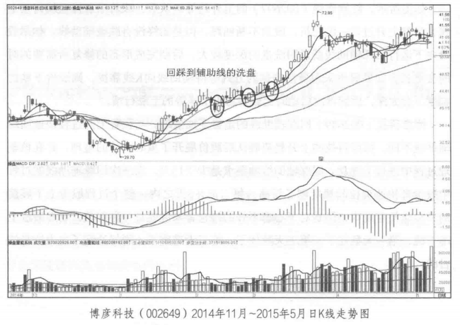 在前面我们介绍了主力操盘过程中常用的均线系统,此处再补充介绍一根均线———20日均价线,也叫辅助线。因为在下降趋势和横盘整理中不需要关注该线,只有在上升趋势形成后的洗盘阶段才会用到此线,所以之后我们不会再提到该线。
