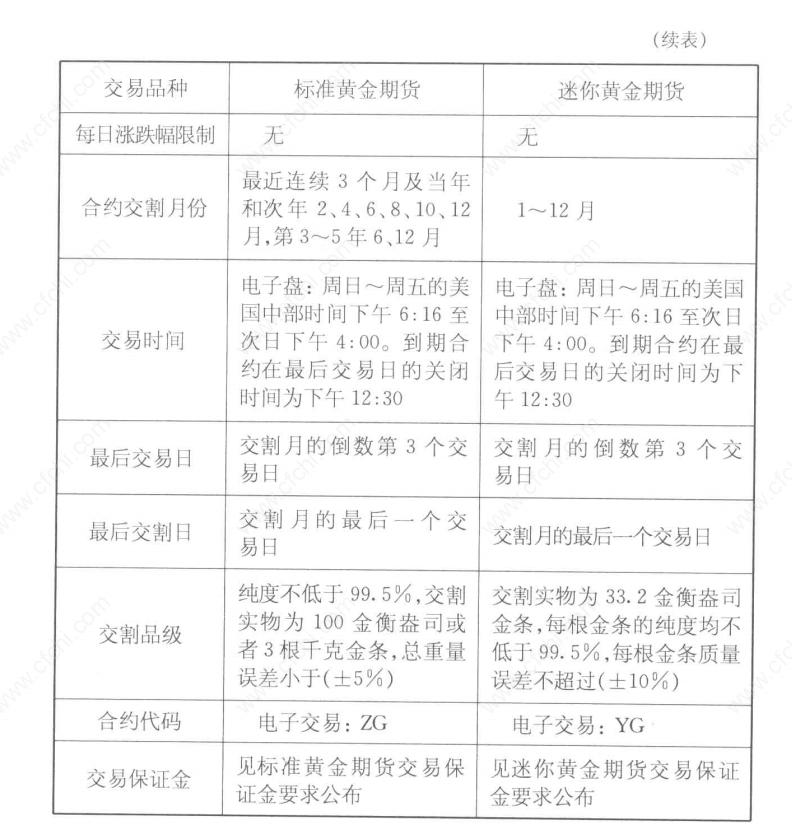 (2)芝加哥商品交易所(CBOT)芝加哥商品交易所的黄金期货合约包括100盎司/手的标.准合约和33.2盎司/手的迷你合约,见表下