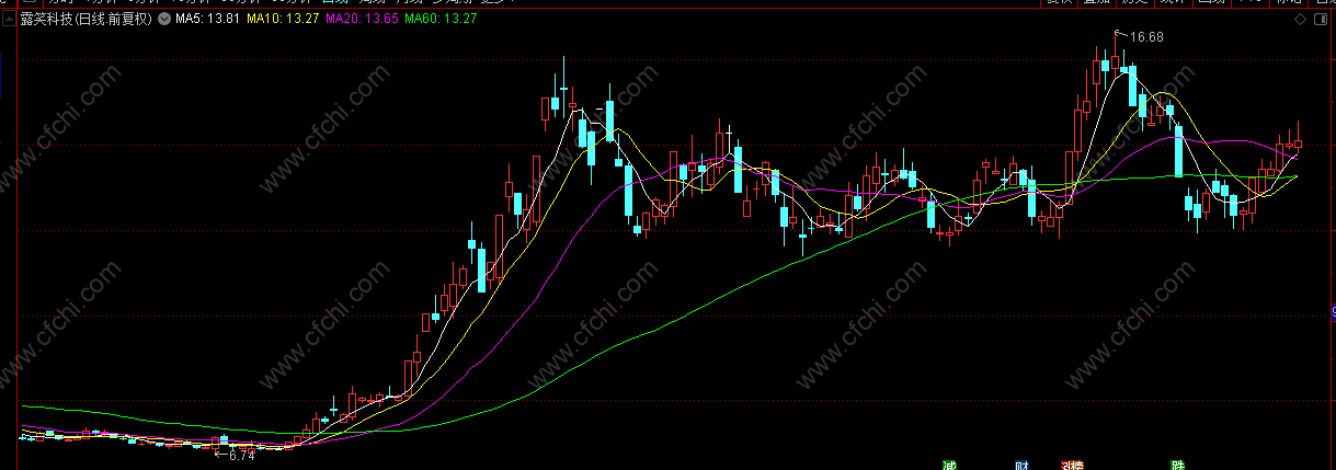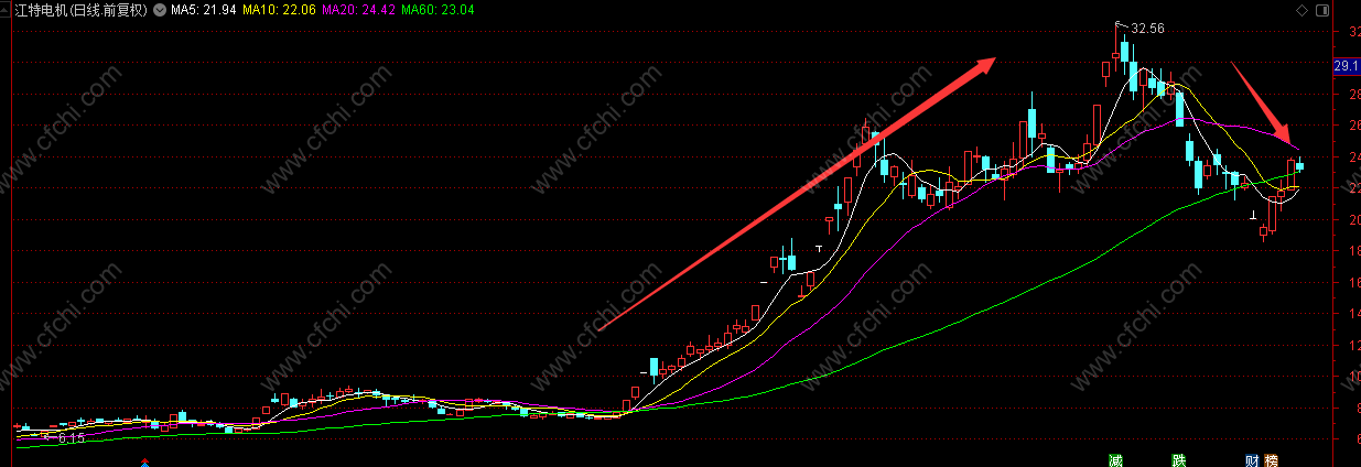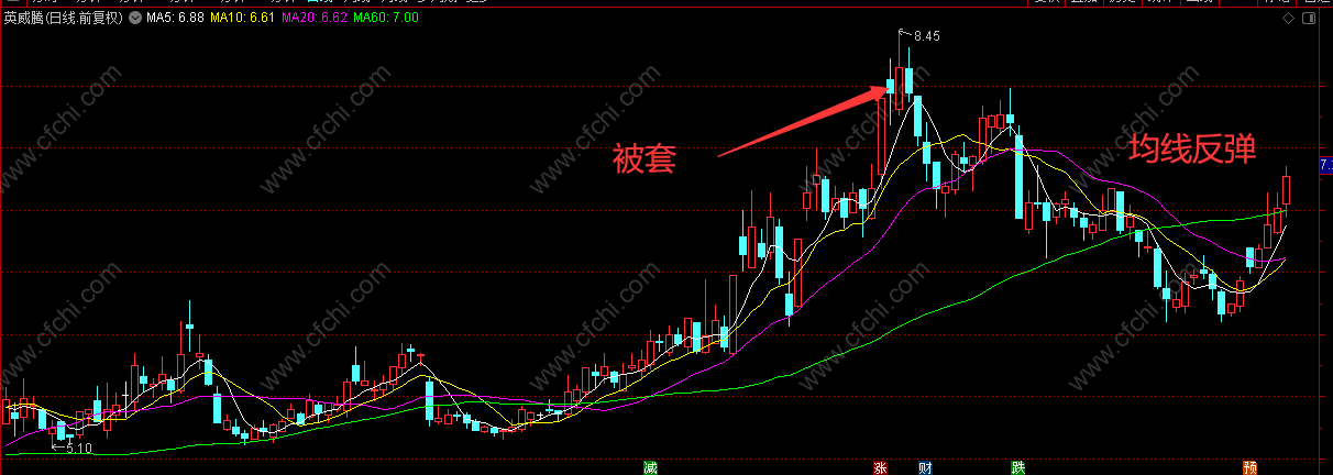 如果一个趋势股票突然下跌,导致被套,怎么办?这时候可以看看均线,等待反弹。根据网上流传概率,如果一个趋势股下跌。那么在20、60日均线的时候,反弹的机会会大很多。这时候,可以根据均线反弹操作。如下面几个图:英威腾、江特电机、露笑科技