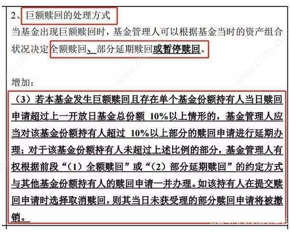 ②部分延期赎回:如果基金管理人无法全部兑付,可以在不低于上一日基金份额10%的前提下对其余赎回进行延期。