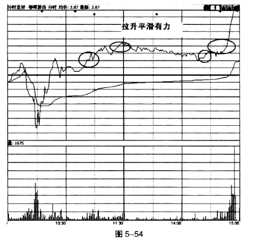 个股在盘中突破箱体起涨时,若为真实起涨,则在突破箱体前后,成交量是由小量逐渐加大的,且分时走势图上的成交量出现连续几分钟红柱、甚至更长时间。这在分时图上的直观表现就是拉升波平滑有力,如图5-54所示。