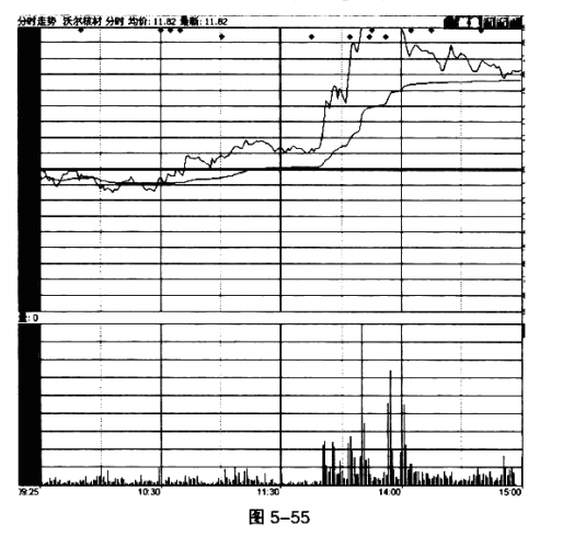 在创新高时,一般要有一分钟的成交量是当日至创新高时止的最大成交量。主力愿意在新高价处用最大成交量去拉抬,说明买入的真实和急切,如图5-55所示。