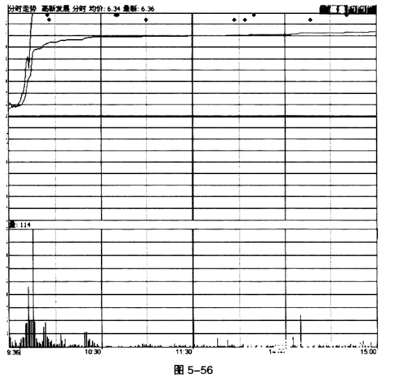 因为主力在封停时动用了大量资金,目的是不想散户抢盘。打开停板则是想清洗浮筹或进一步吸筹,过一段时间一般会再封上。巨量封涨停也使主力仓位增加,仓位在增加,就没有出货,如果该股次日仍高开高走,股价仍处于相对低位,形态良好,则后续升幅可观(如图5-56)。