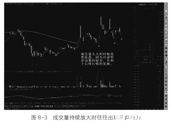 2.成交量持续放大(见图8-3)或换手率太大时说明跟风盘太多,同时表明浮动筹码过多,也容易出现洗盘行为。