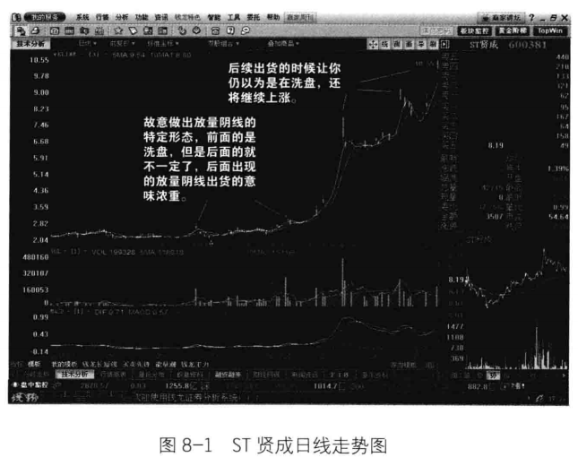 图8-1中,ST贤成( 600381)就是故意作出放量阴线的形态特征,前两次放量收阴后又涨上来了,给你的感觉是放量阴线不可怕,后面再出现放量收阴线的时候,广大的投资者就会麻痹大意,主力也会借此顺利出局,有点儿“狼来了”的味道。