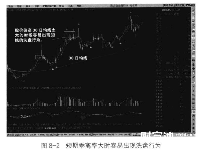 1.短期乖离率偏大时(见图8-2),说明跟风盘短线获利丰厚,主力将要洗盘。股价经过短线上涨后远离30日均线的时候,成交量不能持续地放出(出现缩量),就说明将要短线洗盘。