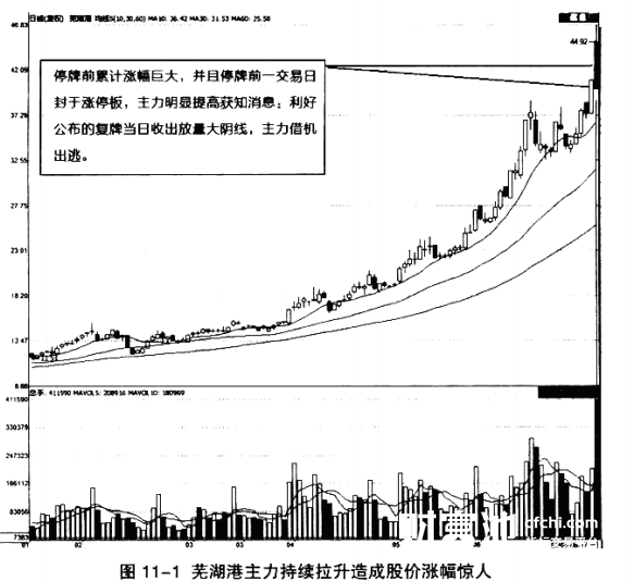 图11-1为芜湖港2009年8月17日前的K线走势图。此股在2009年7月14日停牌前、股价持续上扬、期间几乎没有出现过较大幅度的回调,只是在2009年6月23日~ 7月13日出现过一段横盘整理走势,但是伴随着2009年7月14的一个涨停板,股价再次出现突破的走势,其走势远强于大盘,这时的股价相对于2007年11月份的低点来说,已经翻了6倍,涨幅惊人,这是主力持续拉升造成的。