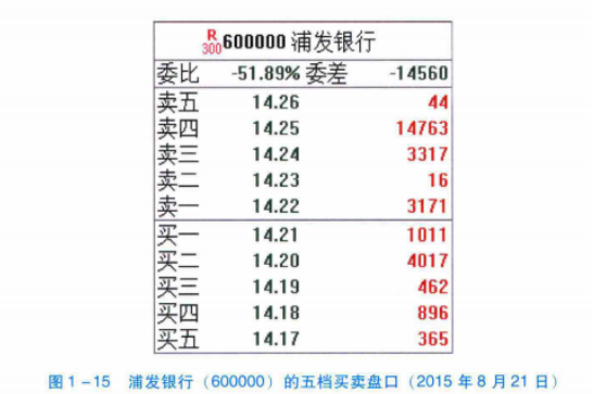 图1-15为2015年8月21日收盘后浦发银行的五档买卖盘口数据。其中,中间的一组数字代表等待成交的价格,最右边的一组数字代表等待成交的股票手数。例如,“卖四14.25 14763” 代表在14. 25元的价位上有14763手股票的卖单正在等待成交。“买一14.21 1011” 则代表在14.21元的价位上,有1011手股票的买单正在等待成交。