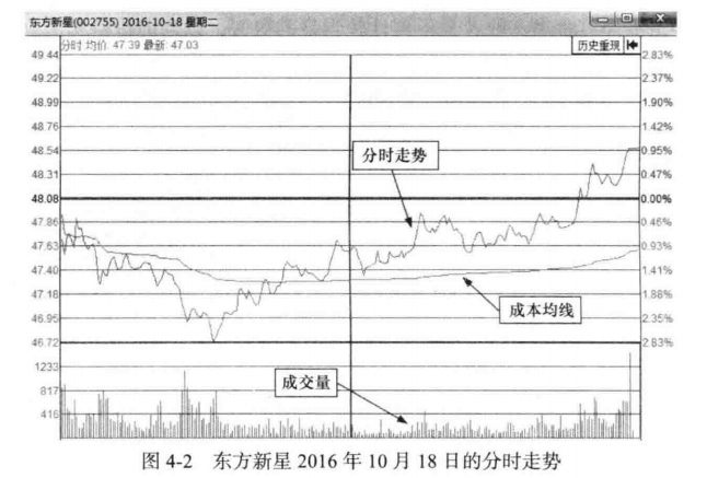 笔者在后面的章节中,会逐步提到均价线在分时图中的重要用途。下面以东方新星(002755)在2016年10月18日的分时走势为例进行讲解(见图4-2)。