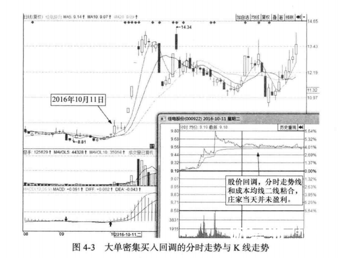 如图4-3所示的佳电股份(000922),2016年10月11日盘中连续出现密集的庄家大单买入成交。尾盘回调后,股价接近于当日成本均线,庄家短线没有获利,没有短线洗盘的空间,出现了比较好的介人机会。