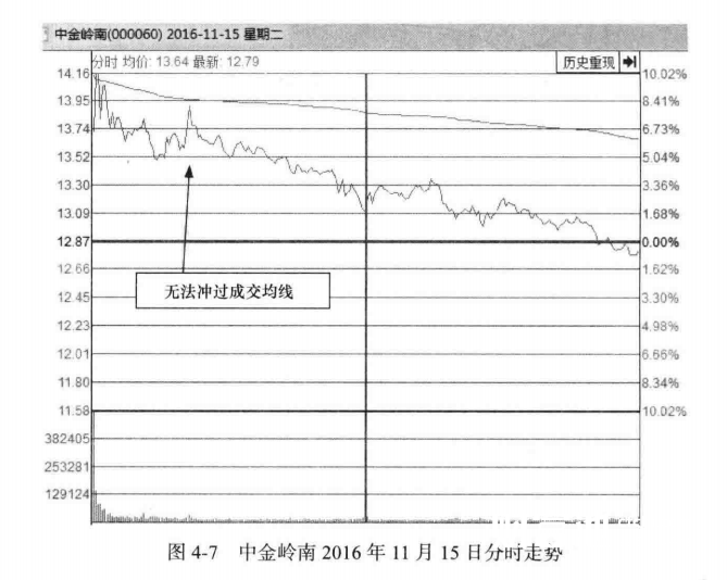 盘中虽数次上冲,却始终无法冲破成交均价线,股价持续下滑,收盘跌0.62 %,套住了当日高位入场的短线资金(见图4-7 )。