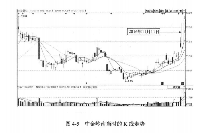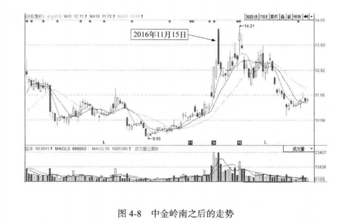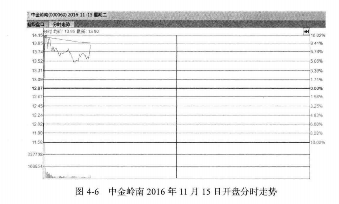 2016年11月15日,中金岭南以涨停价格开盘,但随后回落,如图4-6所示是其开盘分时走势图。