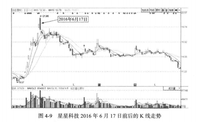 如图4-9所示,星星科技(300256)开始了一波短线行情,十几个交易日内快速拉升,短线庄家炒作痕迹较大。2016年6月17日大幅跳空高开。
