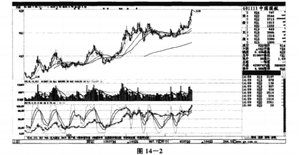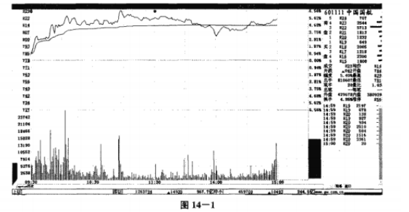 如图14-1所示,中国国航(601111) 在股价高开之后,10点之前并没有回落到开盘价的位置,而是继续震荡走高,这说明股价走势处于强势当中。从图14-2的日K线走势上,我们可以看出此时的股价处于一个持续上升的阶段,上升动力强劲,同时出现这种走势的,投资者可以在10点之后进场买进。