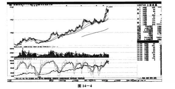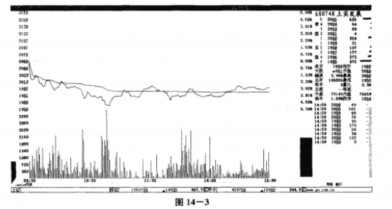如图14-3所示,上实发展(600748) 股价在低开之后,一路下行,一直没有回升到开盘价的位置,这就说明股价走势相当疲软,投资者信心缺乏,出现这种走势时不应该进场操作。而从图14-4的日K线走势图上也可以看到,此时股价已经处于顶部,有下降的趋势,加上走势疲软,因此我们可以判断这只股票还会沿着原来的趋势继续下跌。
