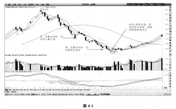 图4-1(周K线图)展示了2008年大盘构筑头肩底形态过程中与政策时间差的情况。沪市大盘自2007年的6124点一路下跌所伴随的政策变化,前两次的降低印花税虽然博得了反弹,但都没有改变市场趋势,直到4万亿元投资的经济刺激计划加上适度宽松的货币政策和积极的财政政策出台后,才真正见底。这就是利好与大底形成过程中的时间差。