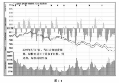 如图1-1所示,在红白两条曲线附近有红绿柱状线,即时反映大盘所有股票的买盘与卖盘在数量上的比率。红柱线的增长减短表示上涨买盘力量的增减;绿柱线的增长缩短表示下跌卖盘力度的强弱。指数在上涨过程中,红柱线越长,表示上涨力量越强,大盘越容易上攻;在下跌过程中,绿柱增长,表示下跌动能增强,下跌的势头更勐。