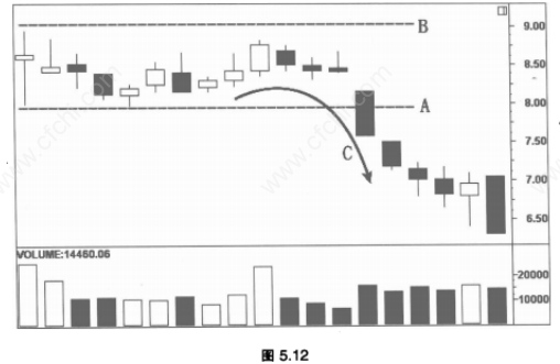 股价盘整后,向下突破,跌破前期盘整箱体的低点,在盘整区域介入的投资者应以箱体的下沿A线为止损点,避免股价继续下跌损失进一步扩大。如图5.12。