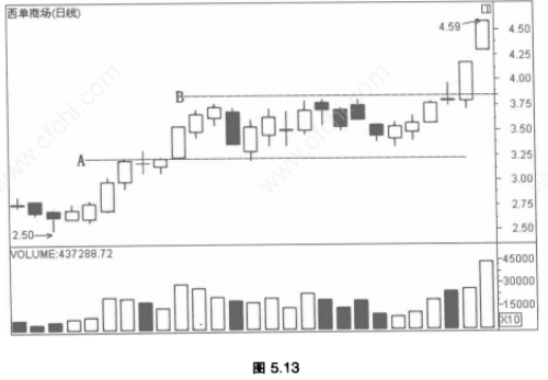 股价盘整后,向上突破,带量突破前期盘整的箱体上沿,股价步入正常的升势,此时是投资者介入的最好机会。如图5.13。