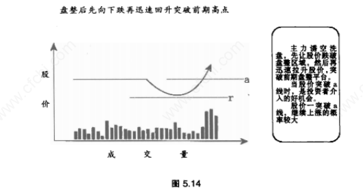 这种走势形态我可以理解成是主力的洗盘行为,股价跌破前期盘整平台,迫使跟风的散户抛股离场,待浮筹被清理后,又迅速拉升股价,让卖出股票的散户踏空行情;如果出现这种走势的个股,在股价突破前期箱体顶部时是投资者介入的最好机会。如图5.14。