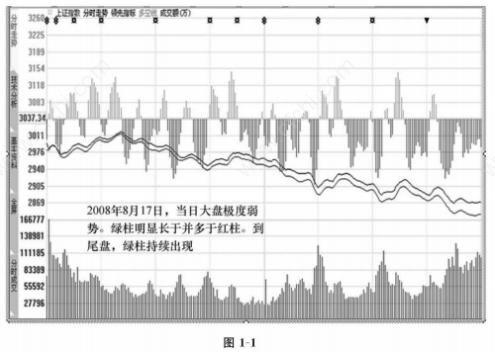 如图1-1所示,在红白两条曲线附近有红绿柱状线,即时反映大盘所有股票的买盘与卖盘在数量上的比率。红柱线的增长减短表示上涨买盘力量的增减;绿柱线的增长缩短表示下跌卖盘力度的强弱。指数在上涨过程中,红柱线越长,表示上涨力量越强,大盘越容易上攻;在下跌过程中,绿柱增长,表示下跌动能增强,下跌的势头更勐。