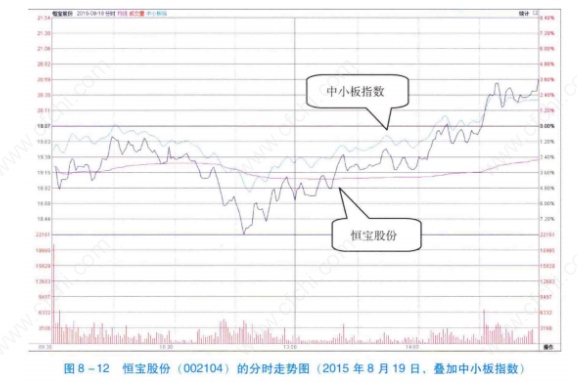 如图8-12所示,2015年8月19日收盘前,恒宝股份(002104) 见底反弹,开始持续上涨。该股上涨的同时,中小板指数也持续上涨,两者形成了几乎同步上涨的趋势。这样的形态说明该股的上涨得到了整个市场的认可,未来将会持续上涨。在股价上涨的过程中,投资者可以积极追高买入。