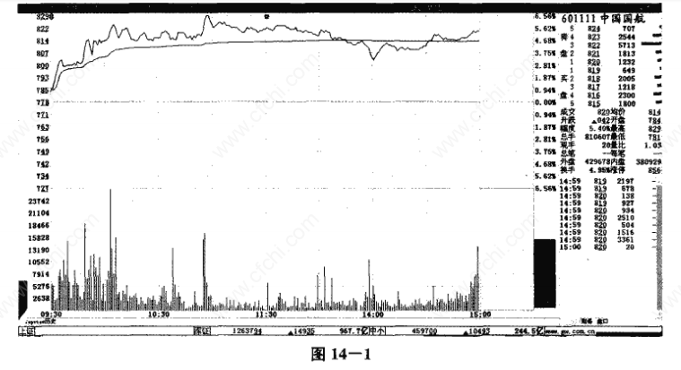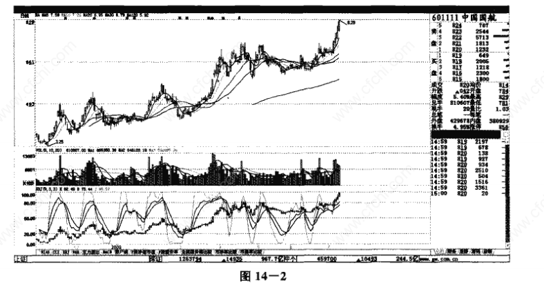 如图14一1所示,中国国航(601111)在股价高开之后,10点之前并没有回落到开盘价的位置,而是继续震荡走高,这说明股价走势处于强势当中。从图14一2的日K线走势上,我们可以看出此时的股价处于一个持续上升的阶段,上升动力强劲,同时出现这种走势的,投资者可以在10点之后进场买进。