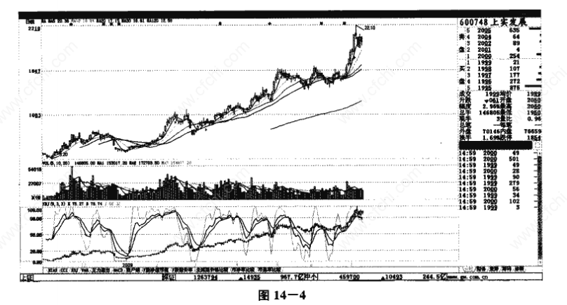 如图14—3所示,上实发展(600748)股价在低开之后,一路下行,一直没有回升到开盘价的位置,这就说明股价走势相当疲软,投资者信心缺乏,出现这种走势时不应该进场操作。